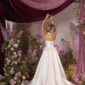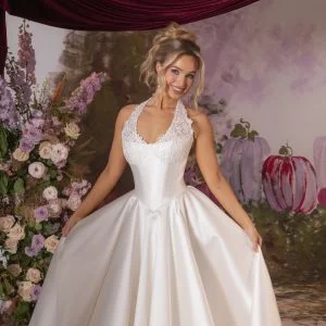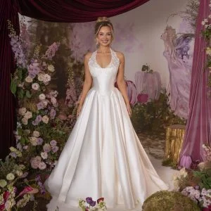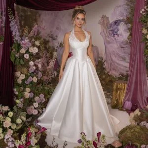 Ella is a guipure lace halter-neck wedding gown with a sculpted Basque waist and a full circle mikado skirt. The bodice features full internal corsetry for a beautifully supported silhouette, while the hand-stitched guipure lace appliqué creates a striking halter neckline. Crafted from the most luxurious mikado, Ella blends structure, craftsmanship, and romantic artistry in one effortlessly graceful design.