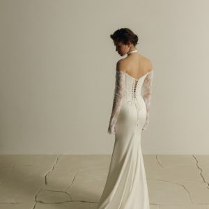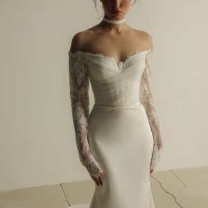 Leif is a dress made of dreams. Its delicate lace bodice and gentle tulle drape effortlessly over the corset. The gown hugs every curve with grace, while the satin skirt exudes a luxurious, timeless elegance. Finished with lace sleeves that add a touch of decadent romance, Leif is a vision of classic beauty reimagined.