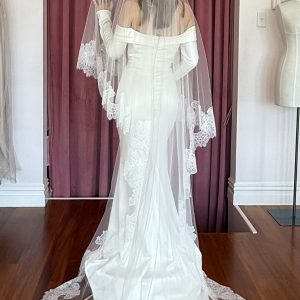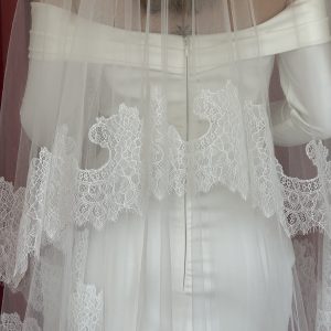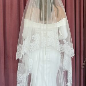 A delicate veil for the true romantic. Crafted from soft, ethereal tulle, this piece is finished with a fine Chantilly lace with a dramatic blusher.