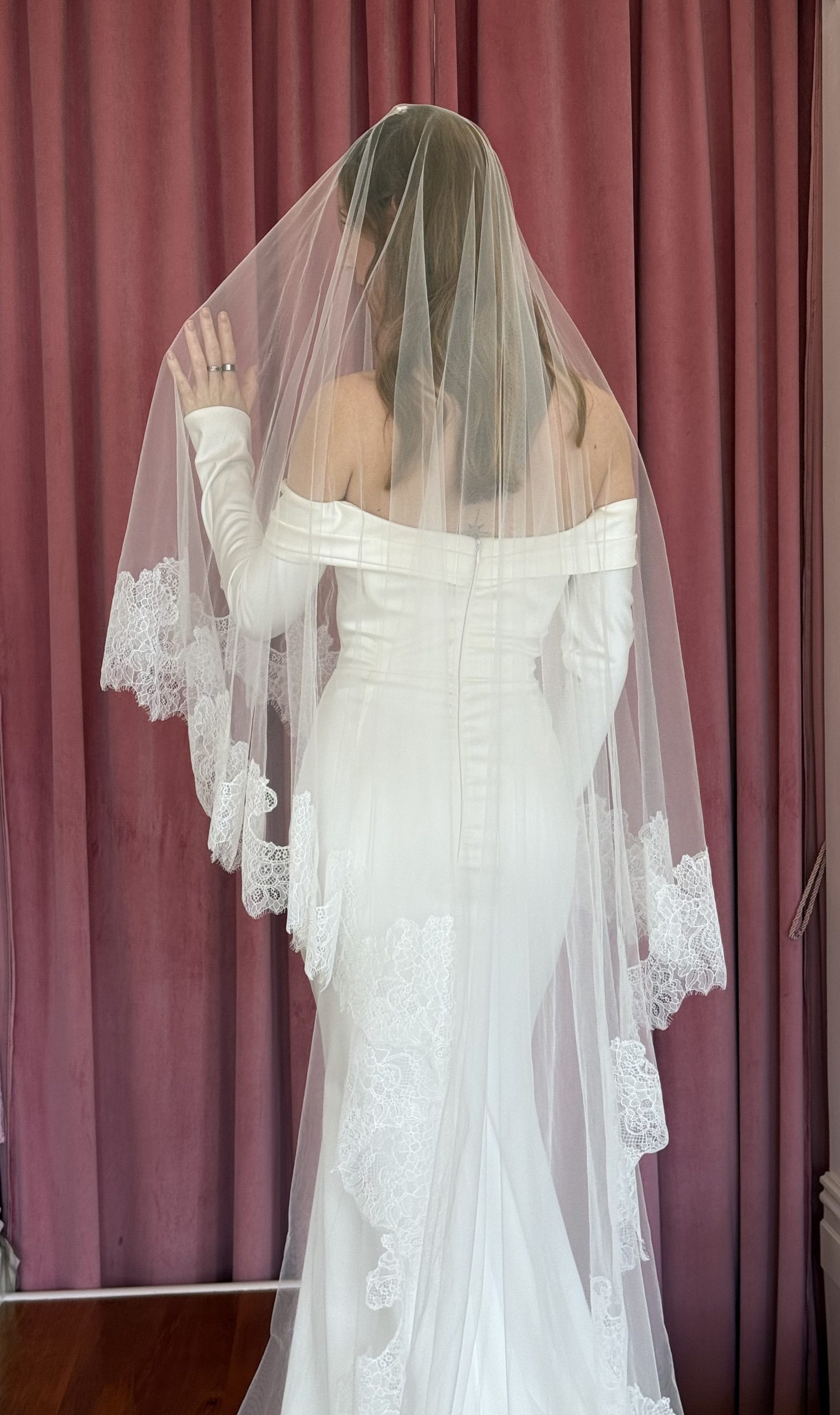 A delicate veil for the true romantic. Crafted from soft, ethereal tulle, this piece is finished with a fine Chantilly lace with a dramatic blusher.