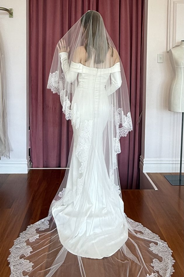 Please note: This veil is made to order. Once your order is placed, our team will begin the creation process. Production times range from 4 to 14 weeks. If your timeline is tight, please let us know when placing your order, we’ll do everything we can to accommodate you.