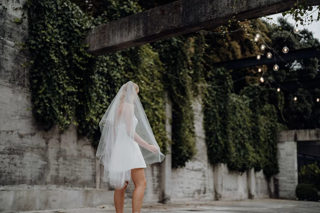 All Veil lengths are customisable, and available to try on at our Auckland studio. The Charlie Veil is available in a range of non-bridal colours. Model wears 1.3m length.