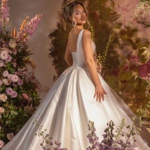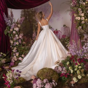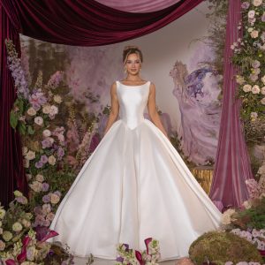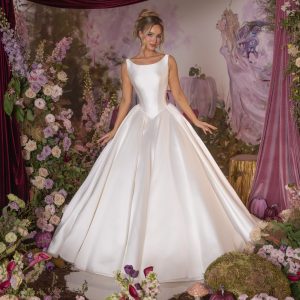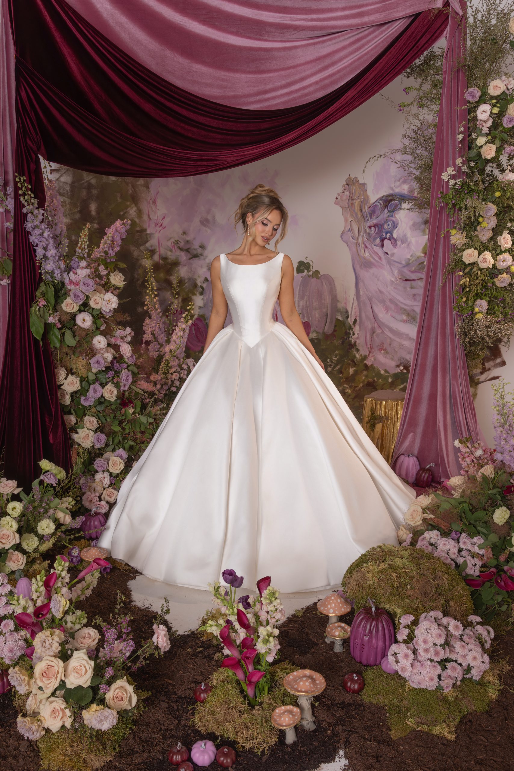 Cass is a striking boat-neck ball gown crafted from the most luxurious mikado. The dropped Basque waist and low back create a sculpted, romantic silhouette, complemented by delicate button detailing that trails down the back into a lush, flowing train. A removable petticoat offers two distinct looks – full and voluminous for dramatic moments, or softly structured for a more understated elegance.