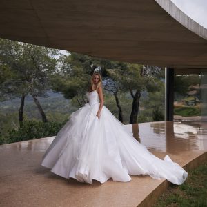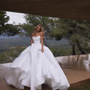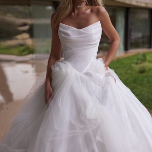 Deliz is a romantic taffeta gown with a voluminous silhouette, featuring a masterfully draped strapless, lace-up corset. A removable tulle overlay offers two distinct looks in one, perfect for the bride who wants both elegance and versatility.