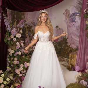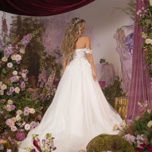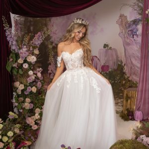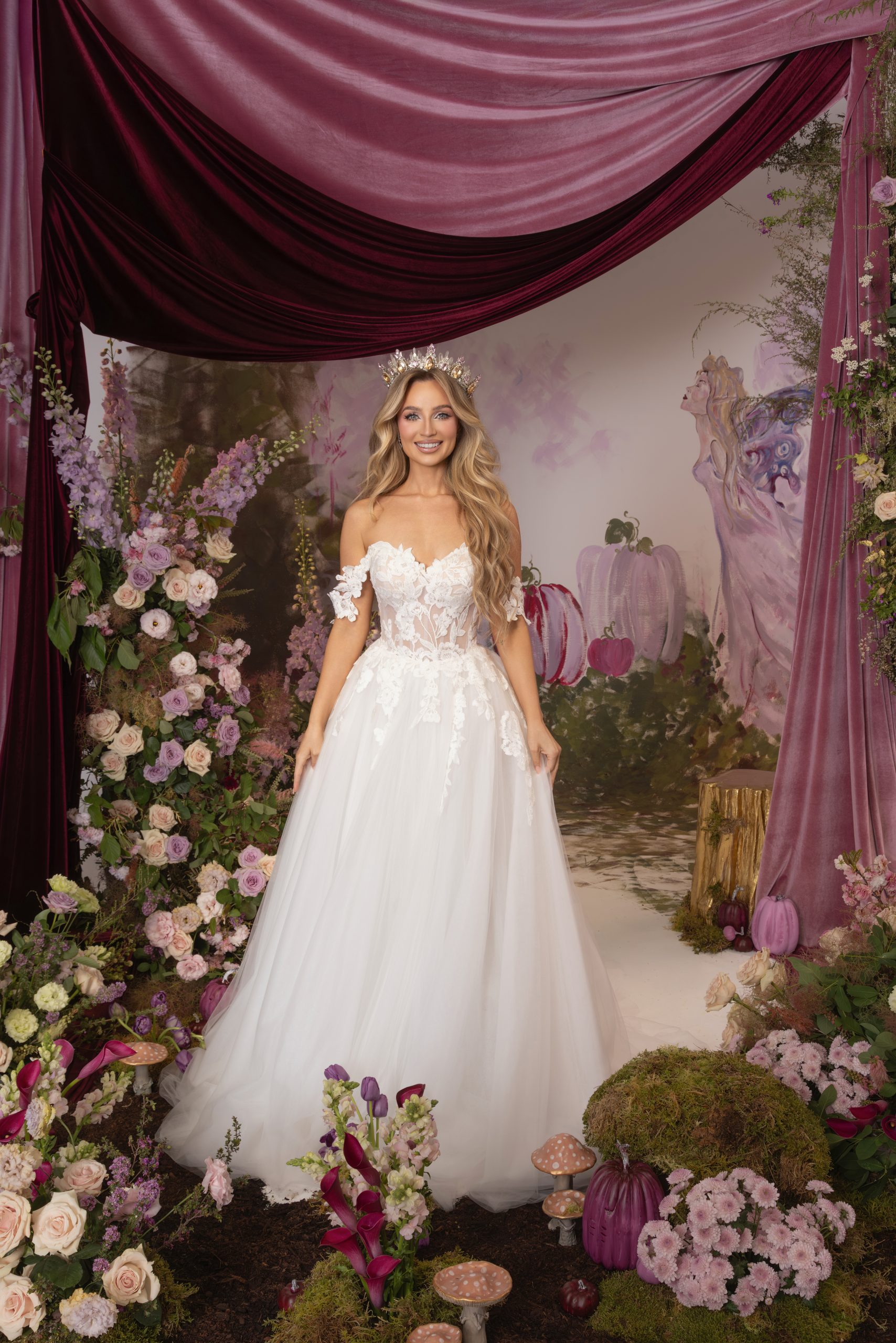 Ivy is a sparkling tulle wedding gown with a sweetheart neckline and detachable off-shoulder draping, exuding effortless romance and ethereal beauty. The sheer bodice is adorned with delicate floral lace appliqué that cascades gently down the skirt, while a subtle layer of hidden sparkle catches the light with every movement. Soft, lightweight layers of tulle create a dreamy, ethereal silhouette, making Ivy a truly enchanting choice for a bride seeking magic and elegance.